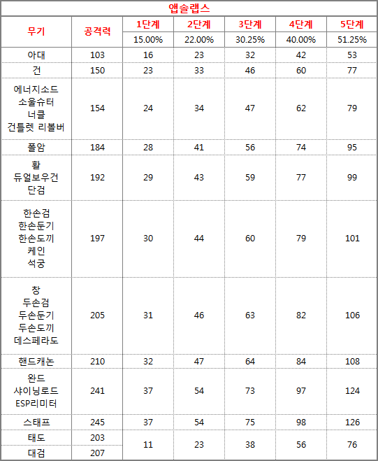 오늘은 메이플에 있는 무기를 다 정리해서 들고 왔습니다. 아케인 셰이드 공격력마력 3단계5추옵 4단계4추옵 5단계3추옵 6단계2추옵 7단계1추옵 아대 가즈 149 27 40 55 72 92 건 피스톨 216 39 58 79 104 133 에너지소드 에너지체인 221 40 59 81 106 136 너클 클로 221 40 59 81 106 136 건틀렛 리볼버 엘라하 221 40 59 81 106 136 소울슈터 소울슈터 221 40 59 81 106 136 폴암 폴암 264 48. 리부트직먹 Lv70 조회154 0845 2 수다 루윌 솔플 무릉층수 쿨레이드 Lv17 조회230 0751 3.